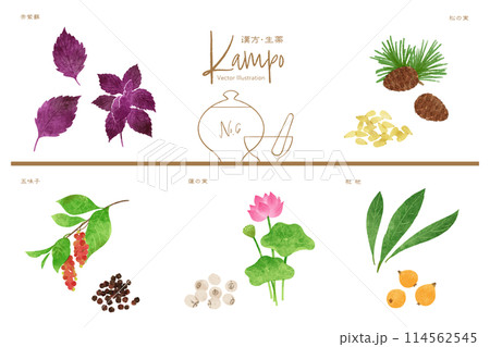 生薬ベクターイラストセット6(赤紫蘇・松の実・五味子・蓮子・枇杷)