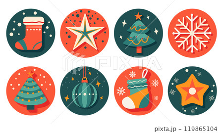 Set of isolated Christmas and New Year label in cute doodle style on transparent background. Volume 4 : Vivid red and green tone colors.