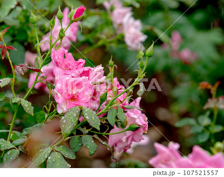 秋雨に濡れながら美しく咲くカラフルなバラ