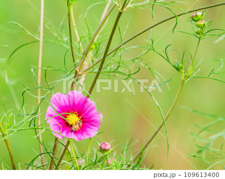 秋の景色 可憐でかわいいカラフルなコスモスの蜜を吸うミツバチ
