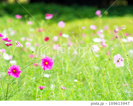 秋晴れの下、花いっぱいの明るく満開のコスモス畑