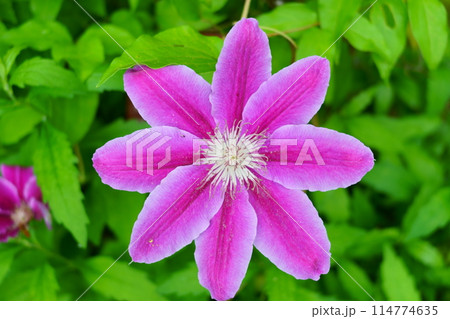 Pink clematis Angela flower on green background closeup. Garden climbing flowers.