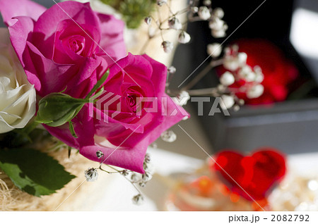 赤いハート型ギフトボックスとハート付きリボンアップ