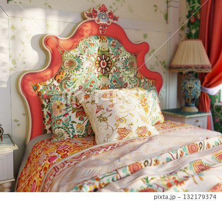 Modern interior design: colorful bedroom with floral headboard