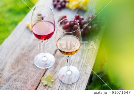 Glasses with white and red wine and grape berries on the wooden table in the vineyards, winery with green leaves background in sunset light. Wine tasting, Degustation. Selective focus, Copy space