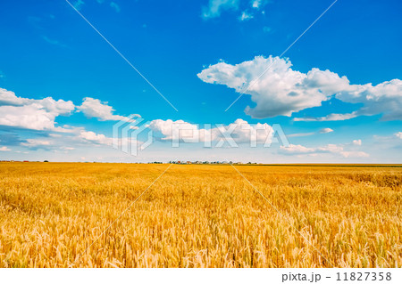 Amazing background of ripening ears of yellow wheat field against blue sky. Harvest nature growth.