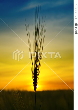 Backdrop of ripening ears of yellow wheat field on the sunset orange sky background. Idea of a rich harvest.