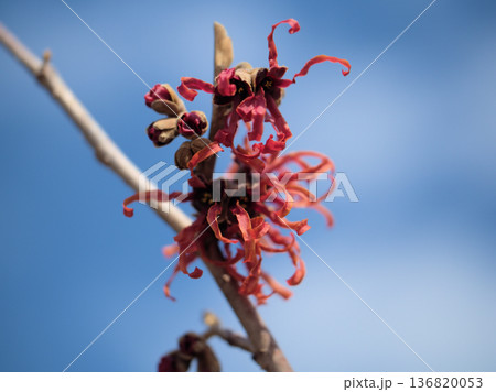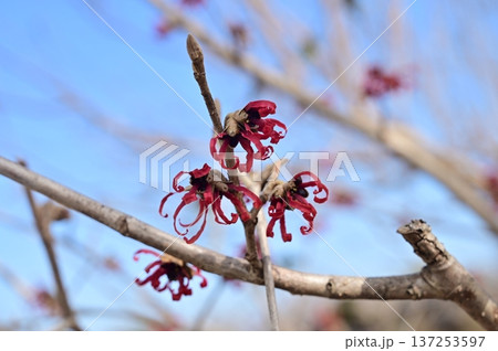 晴れた2月に咲いたハマメリス・インターメディア「ダイアン」の赤い花