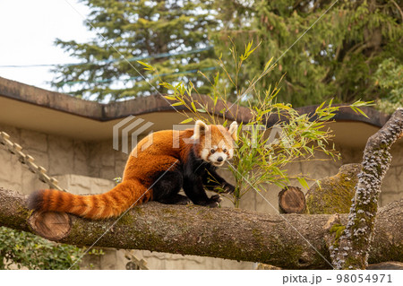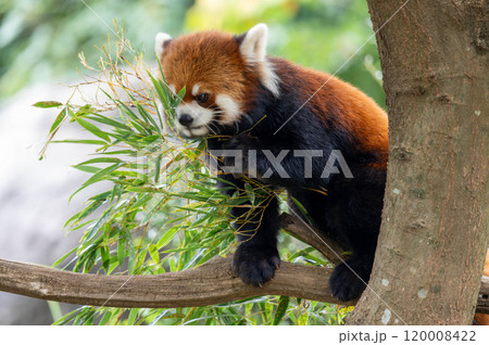 木の上で笹を食べるかわいいレッサーパンダ