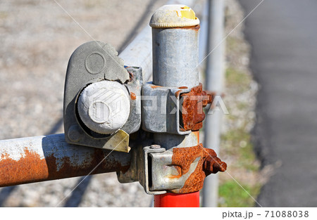 ガードレールがわりの単管と錆び付いたクランプ
