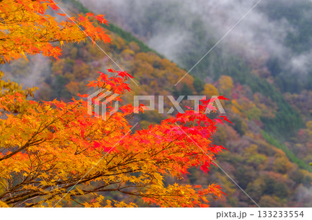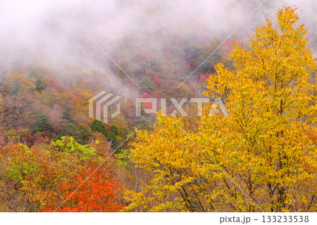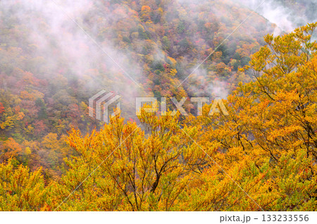 霧湧く紅葉の山肌