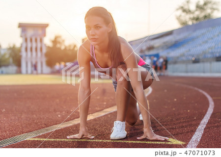 Start. Group of kids getting ready to run on treadmill at the stadium or arena. Little boys, girls in sportswear training as athletes outdoor. Concept of sport, achievements, studying, skills