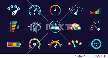 Car energy meters. Electric car battery ev charge meter, speed gauge measure fuel power level indicator scale neon dashboard dial futuristic dash panel, kicky vector illustration