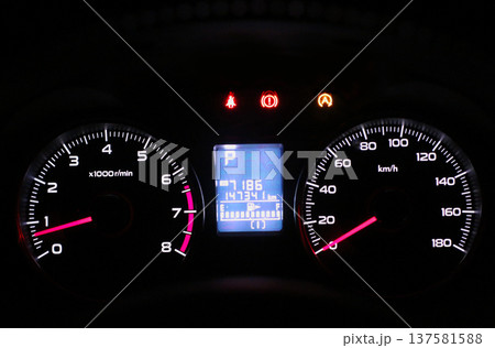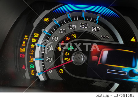 Close up shot of a speedometer in a car. Car dashboard. Dashboard details with indication lamps. Car instrument panel.