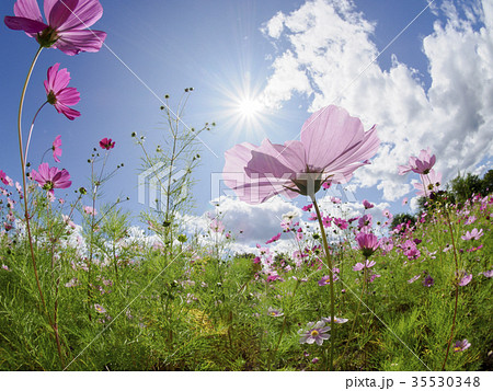 逆光のコスモス、太陽キラリ、フィッシュアイ