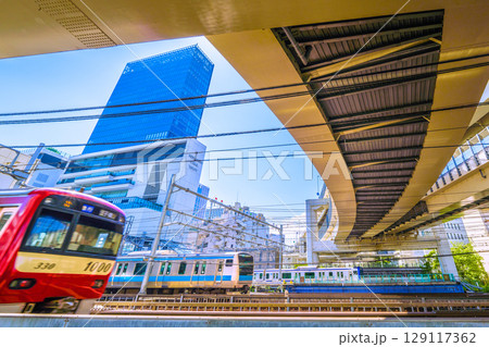 日本の横浜都市景観3電車揃い踏み…横浜駅やJR横浜タワー、電車などを望む