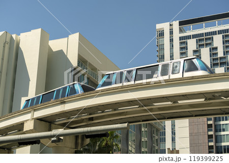 Urban transportation in downtown district of Miami Brickell in Florida USA. Metrorail city train car on high railroad over street traffic between skyscraper buildings in modern American megapolis