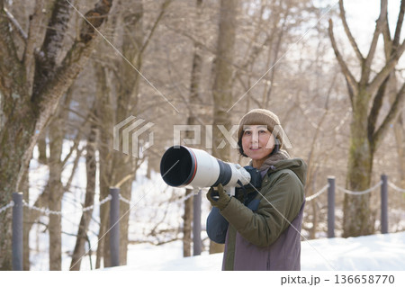野鳥、野生動物の撮影をする女性の後姿 顔無し
