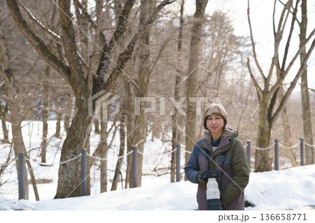 望遠カメラを持つ笑顔の中年女性 カメラ目線 野鳥撮影