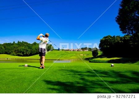 ゴルフ場のティグラウンドで池越えのドライバーショットを打つ男性の後姿(千葉県木更津市)