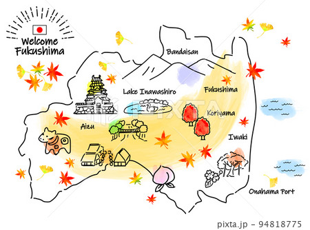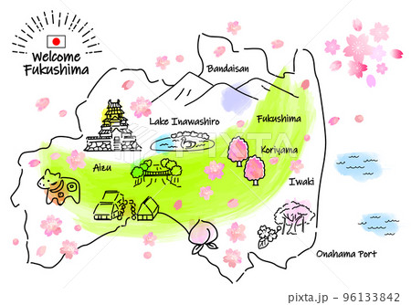 春の福島県の観光地のシンプル線画イラストマップ(ピンク)