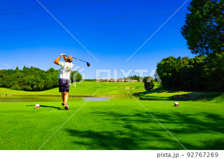 ゴルフ場で池越えのドライバーショットを打つ男性の後姿のパノラマ(千葉県木更津市)