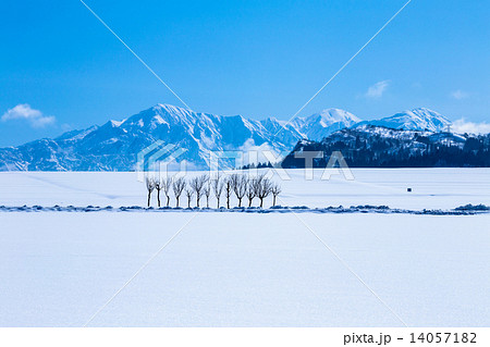 新潟県小千谷市 魚沼コシヒカリの田んぼと、越後三山、ハサ木の雪景色