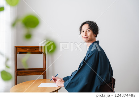 静かなひととき – 和装で手紙を綴る男性
