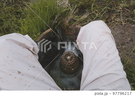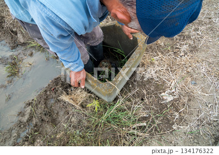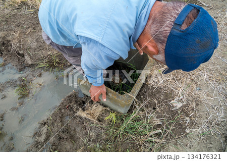 田んぼの水口で足を洗う農家