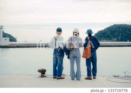 港で並んで立つ3人のポートレート