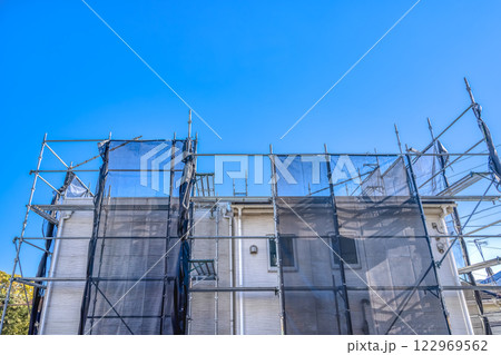 工事現場 新築戸建て住宅の仮設足場組み立て作業風景