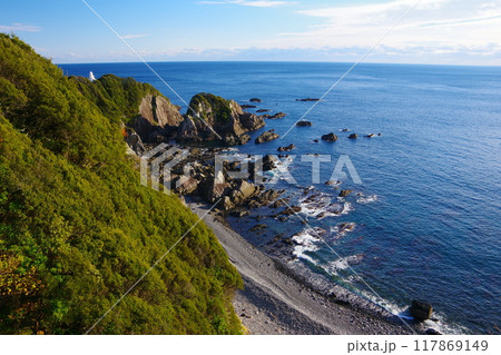 太平洋の青い水平線を背景に断崖から突き出た白亜の叶岬灯台と荒磯の風景 Ver2