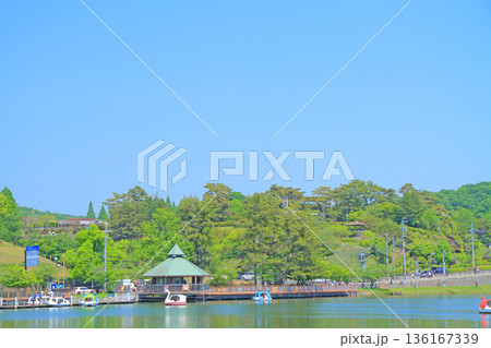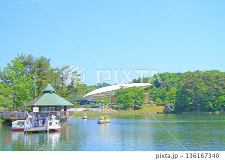 こどもの国の池に浮かぶ足漕ぎボート(神奈川県横浜市)