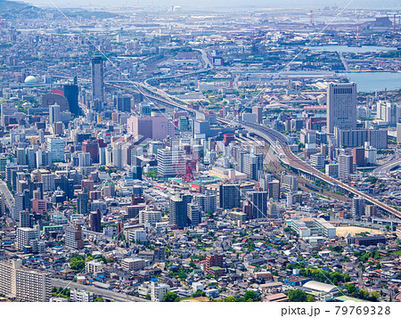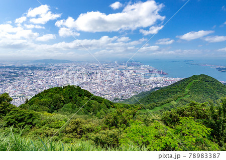 下関かから関門海峡を越えて眺望する夏の青空の北九州都市景観