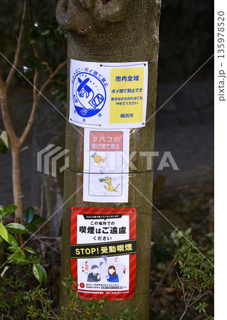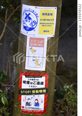 日本の横浜都市景観喫煙はご遠慮ください STOP!受動喫煙…=たむろする高齢者増加=横浜市内