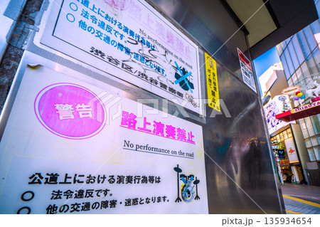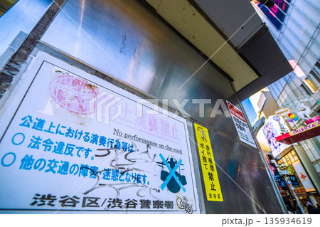 日本の東京都市景観 路上演奏禁止、警告、×…と渋谷スクランブル交差点前に…=令和8年1月1日、元旦