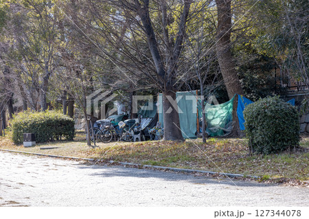 東京都渋谷区美竹公園に設置されたホームレスのテント