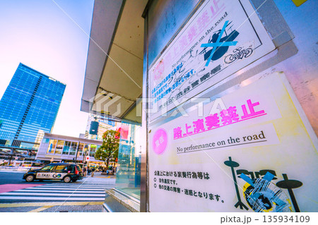 日本の東京都市景観 路上演奏禁止、警告、×…と渋谷スクランブル交差点前に…=令和8年1月1日、元旦