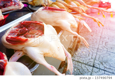 Chicken meat displayed for sale on street market, Vietnam.
