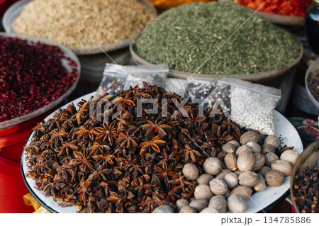 A vibrant and aromatic display of various spices, including star anise, nutmeg, and colorful ground herbs, arranged in large bowls and small bags. This image showcases the rich culinary traditions of