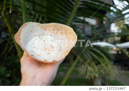 Sri Lanka street food hopper with egg in hand outdoors