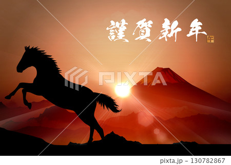 令和八年 午年 年賀はがきテンプレート 跳ねる黄茶色の馬 賀詞・添え書き・年号入り