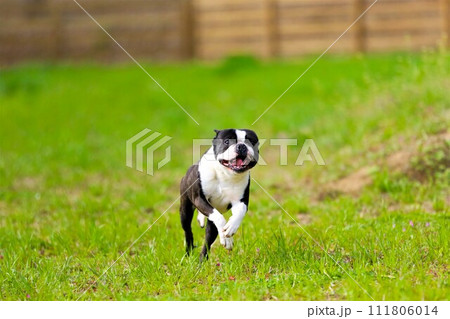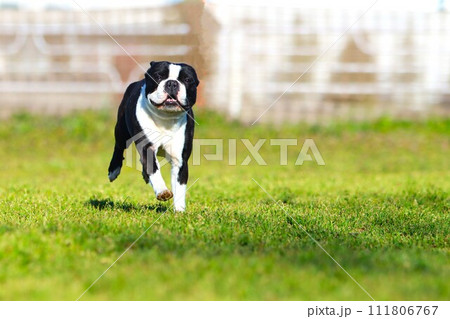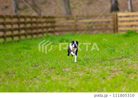 野原のドックランをダッシュするボストンテリアのマイティ君♡