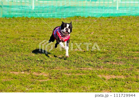 野原のドックランで遊ぶ赤いボーダーシャツのボストンテリア♡マイティ君