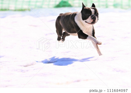 残雪のドックランに喜んで走るボストンテリアのマイティ君♡