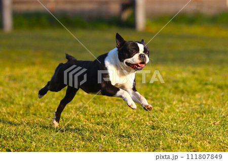 野原のドックランで嬉しそう飛び跳ねるボストンテリアのマイティ君♡