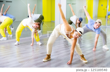 Young girls and boys repeat the movements of dance teacher, training in spacious studio