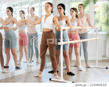 Group of positive young girls engaged in classical ballet in dance studio performs exercise standing in 3rd position of ballet stance