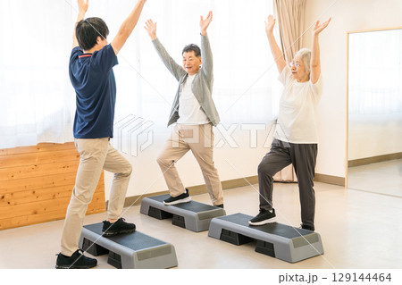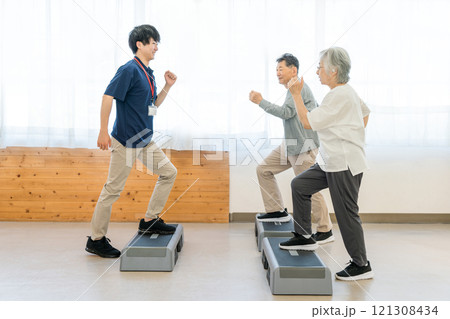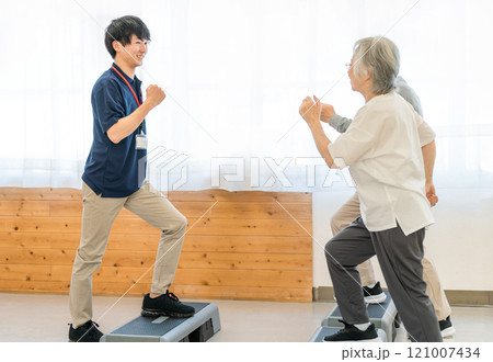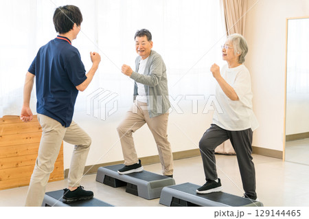 デイサービス・パーソナルジムでトレーニングするシニア世代の男女とインストラクターの若い男性