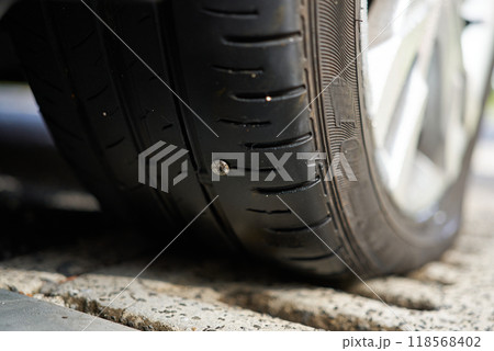 釘が刺さる自動車のタイヤ